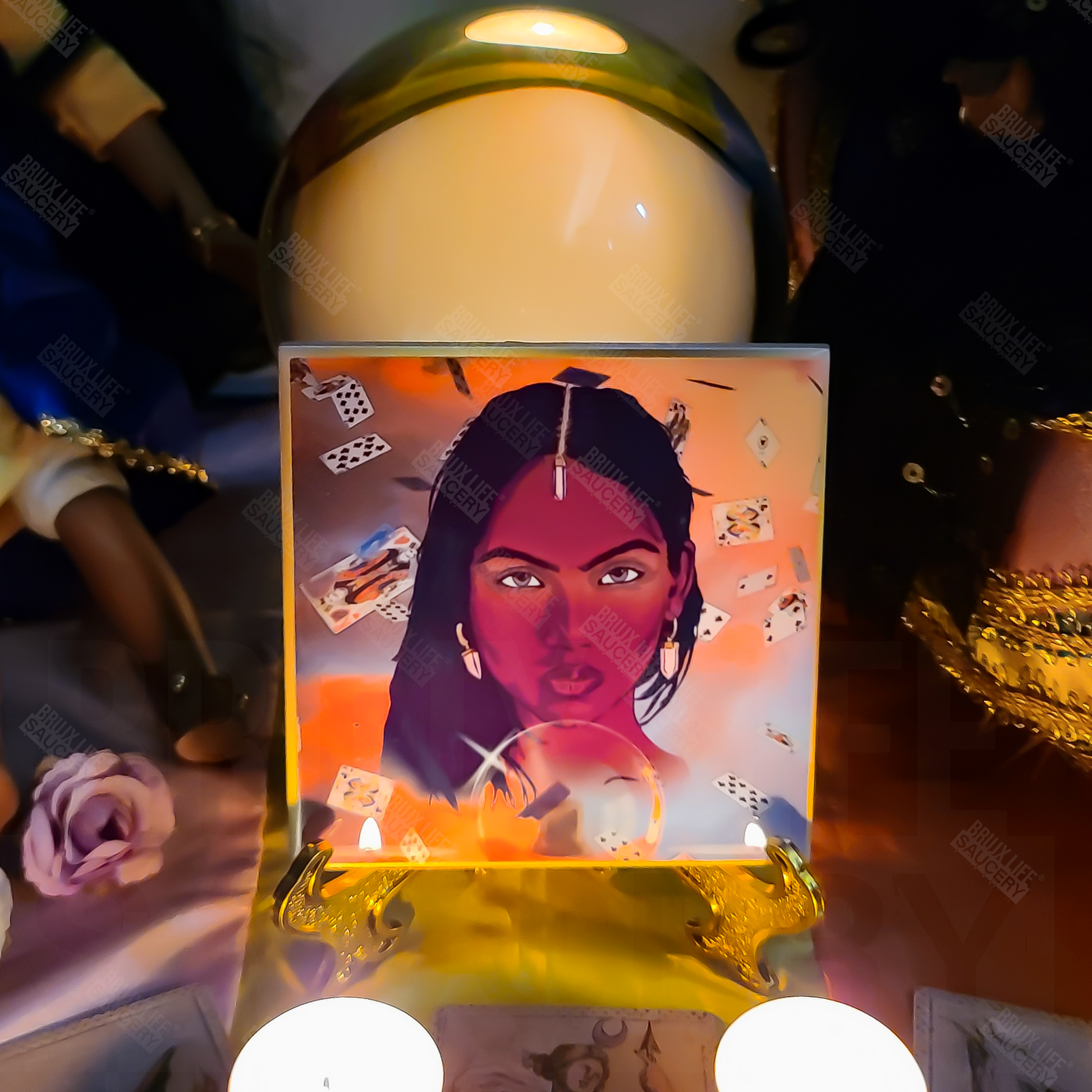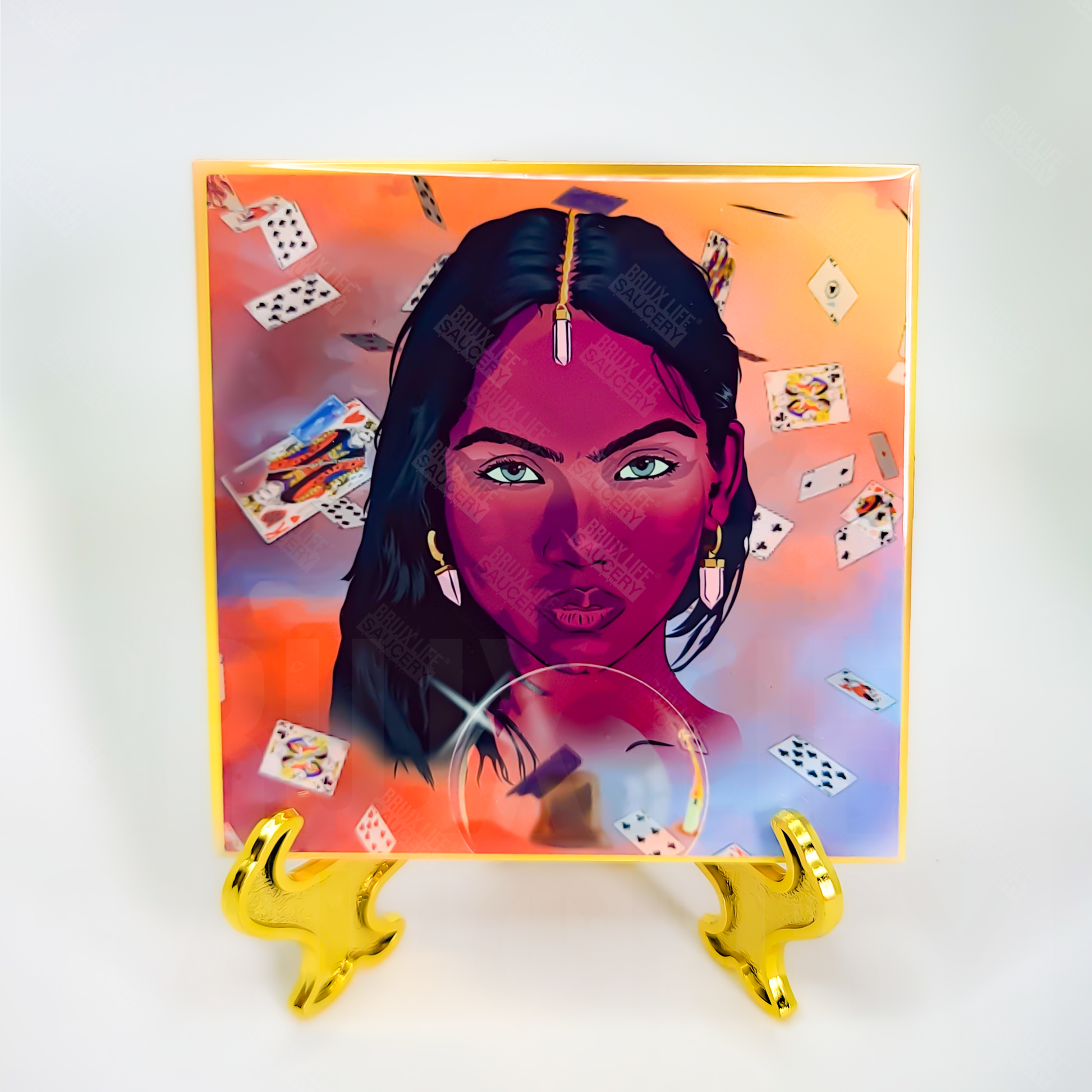 tile can be used as a representation for las gitanas (gypsy) . the image can be placed on the altar along side your divination tools or it can be placed by the door using the stand that is included.