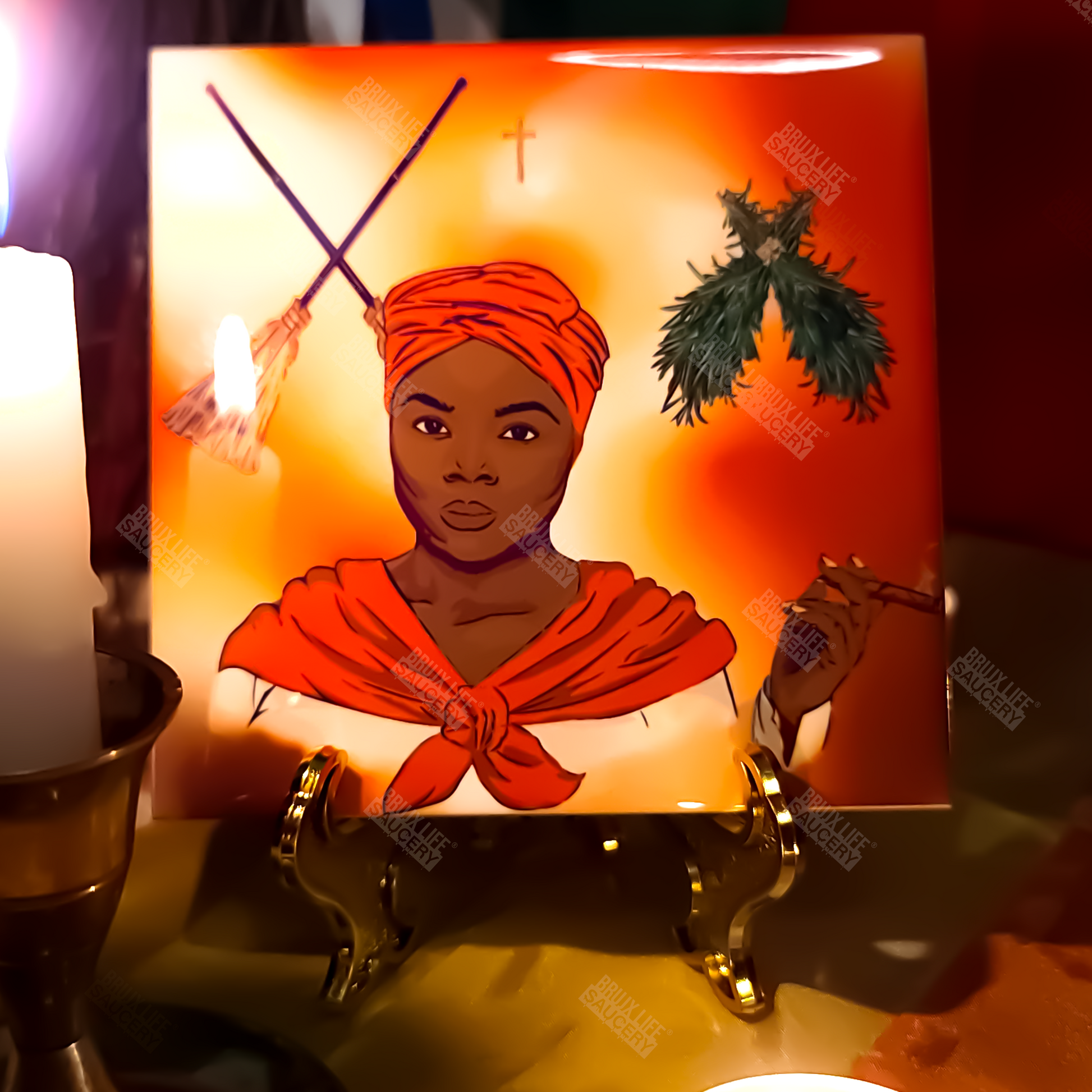 4.25 x 4.25 la madama tile that can be used on an altar as a representation of the madama spirits or it can be hung above an altar space using command strips.
